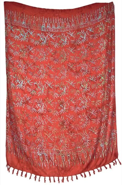 Leichtes Sarong Tuch in Rot mit Türkiser Batik Optik. Die Sarong Tücher entstehen auf der indonesischen Insel Bali in Handarbeit. Duch das Wachsbatikverfahren sind die Tücher durchgängig von beiden Seiten gefärbt, ohne Positiv- und Neagativseite, wie dies bei einfachen Drucken der Fall ist. Es kann gelegentlich vorkommen, das vereinzelte Wachskrümelchen auf dem Tuch verblieben sind. Diese lassen sich ganz einfach durch leichtes Reiben beseitigen.